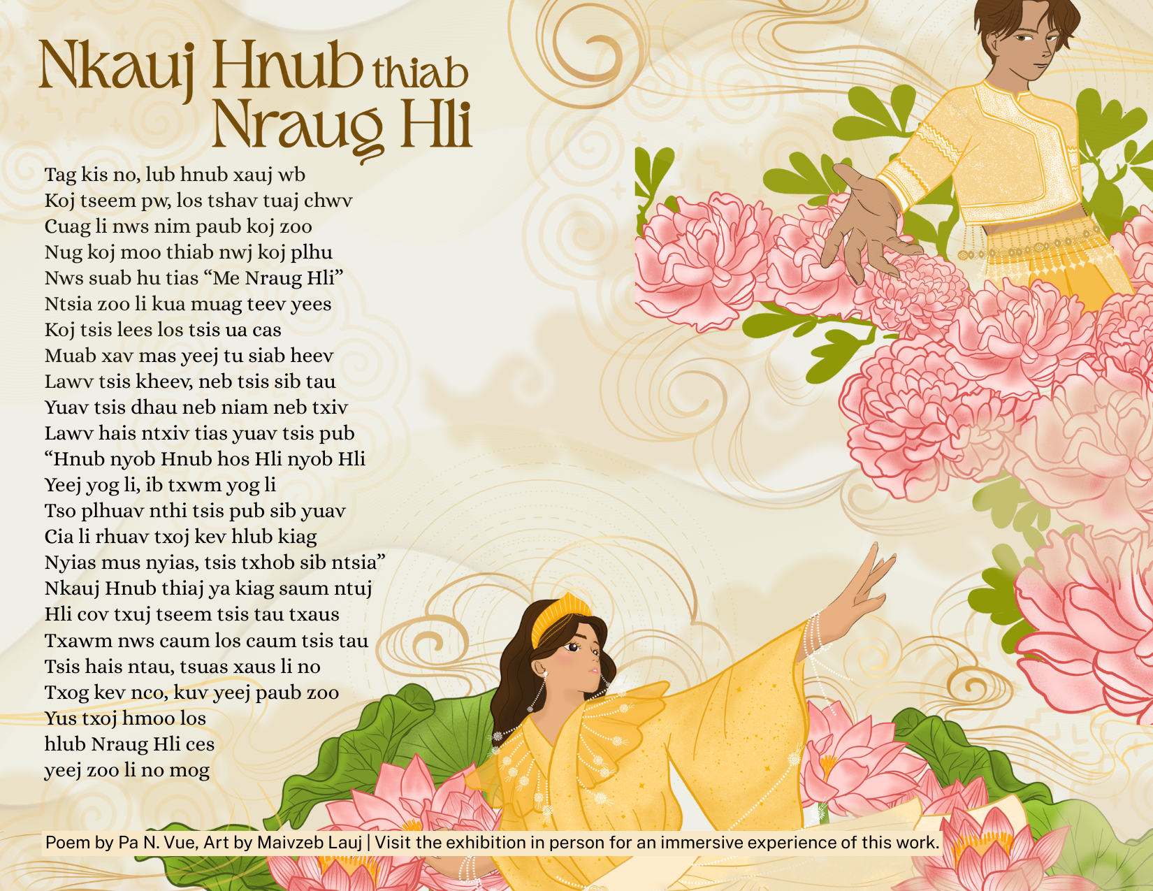 “Nkauj Hnub thiab Nraug Hli” explores a universal theme through cosmic separation and longing. Visit the exhibition in person for an immersive multimedia experience of this piece that includes music and the poet’s voice reading the poem.